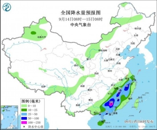 全國降水量預報圖(9月14日08時-15日08時)