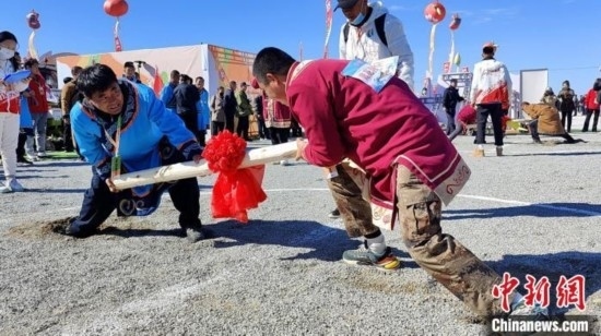 身穿民族特色服飾的赫哲族人在比拼頂杠運(yùn)動。中新社記者 姜輝 攝