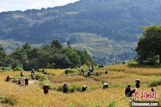 23日,正值秋分時節(jié),也是第六個中國農(nóng)民豐收節(jié),哈尼梯田染上了豐收的色彩。哈尼人民在金黃的稻田里割水稻、捉稻花魚,與四方賓客共慶豐收。為了慶祝豐收,當(dāng)?shù)剡€舉行了大型稻作農(nóng)耕實景表演。身著民族服飾的哈尼族民眾站在田埂上,以稻田為舞臺,以大地山川為背景,唱起悠揚的哈尼古歌,手捧水稻,載歌載舞,表達崇尚自然、感恩自然之情。
