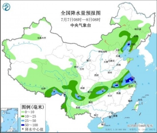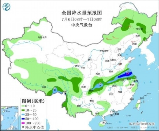 7月6日08時(shí)至7日08時(shí),內(nèi)蒙古東北部、黑龍江南部、西藏東部、江淮、江漢中南部、江南東北部、川西高原、重慶、云南西部等地部分地區(qū)有中到大雨,其中,蘇皖中部等地部分地區(qū)有暴雨或大暴雨(100~110毫米)。內(nèi)蒙古中東部、遼寧、山東、浙江中部等地部分地區(qū)有4~6級(jí)風(fēng)。