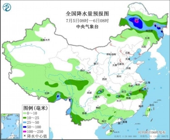 7月5日08時(shí)至6日08時(shí),內(nèi)蒙古東北部、黑龍江中南部以及云南西部、重慶中部、浙江北部等地部分地區(qū)有大到暴雨,其中,內(nèi)蒙古東北部局地有大暴雨(100~110毫米)。內(nèi)蒙古中東部、東北地區(qū)、河北中南部和東北部、山東半島、江蘇中部、浙江中部等地部分地區(qū)有4~6級(jí)風(fēng)。