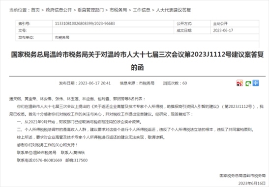 ·浙江溫嶺多位代表委員建議返還企業(yè)高管個(gè)稅,當(dāng)?shù)刎?cái)稅部門(mén)回應(yīng):違反共同富裕原則。