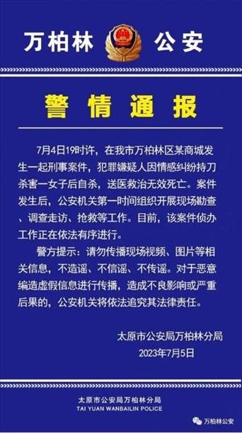 ·太原警方通報(bào)商場(chǎng)發(fā)生刑案:嫌疑人因感情糾紛殺害一女子后自殺。