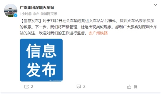 ·深圳火車站就私家車上站臺(tái)致歉:將嚴(yán)格管理,杜絕出現(xiàn)類似現(xiàn)象。