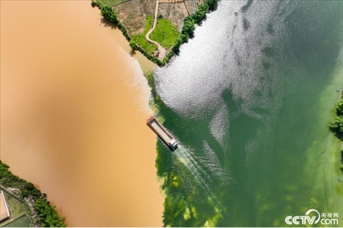 2023年7月4日,南寧三江口左右江交匯處黃綠分明,場(chǎng)面壯觀。每年進(jìn)入汛期后,該交匯處常常出現(xiàn)“鴛鴦鍋”景觀。