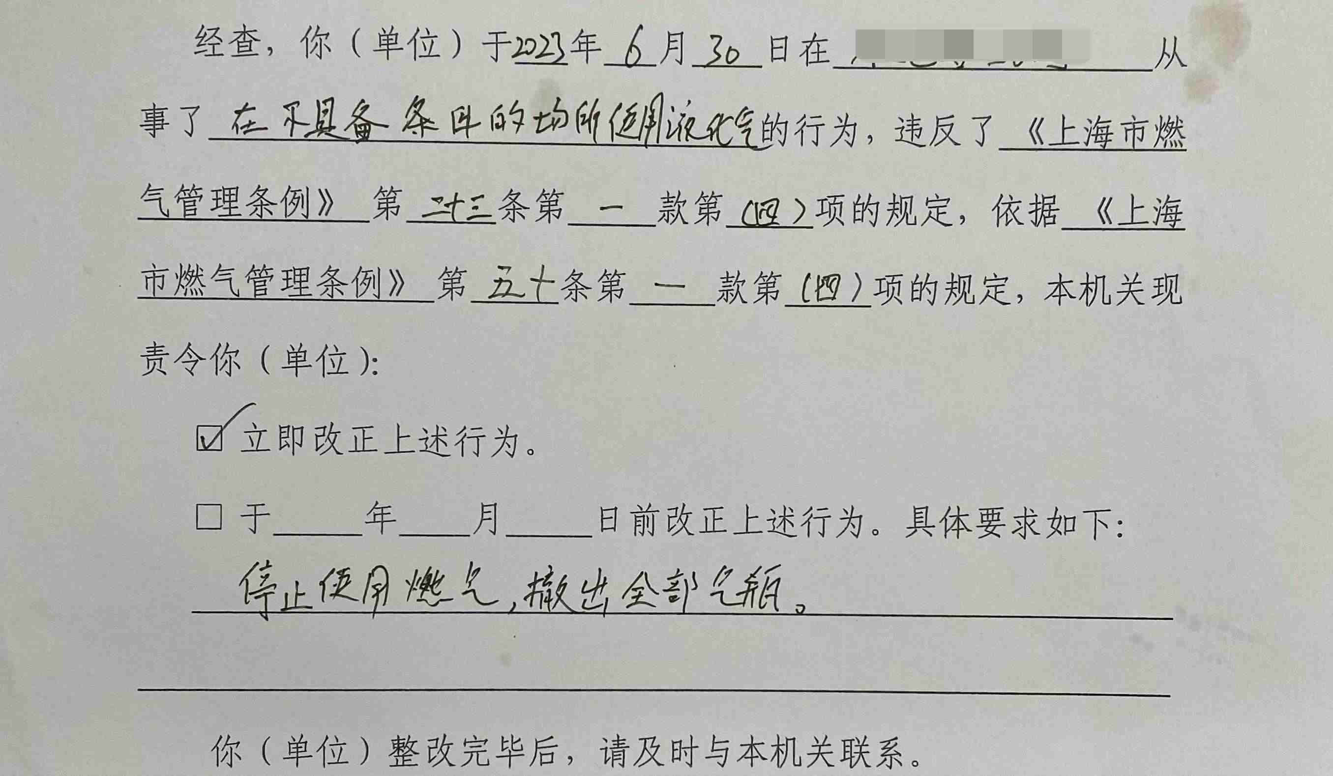 這并不是一次平常的燃?xì)庥猛旰蟾鼡Q空瓶。大概一個小時前,市住建委相關(guān)部門的檢查人員走進(jìn)餐館,檢查后責(zé)令整改,并在整改完成前暫停燃?xì)夤?yīng)。