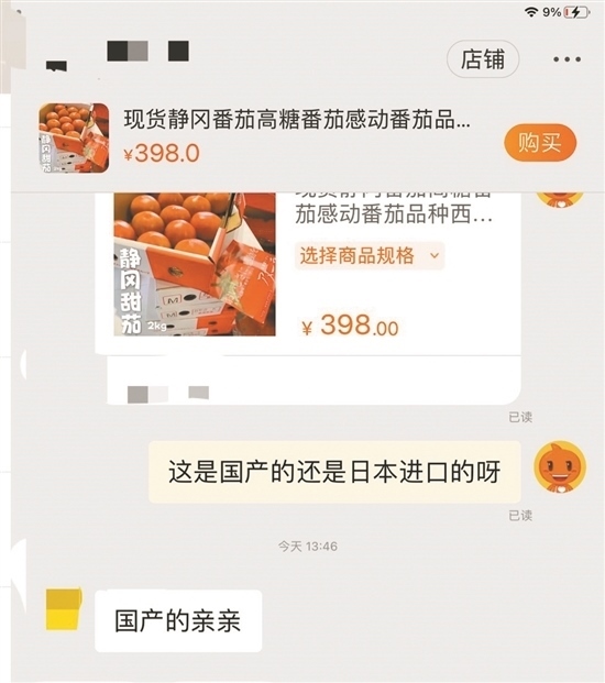 隨后,記者隨機在電商平臺選擇三款標(biāo)明是“進口水果”的產(chǎn)品進行詢問,結(jié)果對方均表示自己的水果是“國產(chǎn)的”。當(dāng)記者詢問一電商客服,標(biāo)價398元兩斤的“現(xiàn)貨靜岡番茄”和標(biāo)價178元一斤的日本淡雪白草莓是哪里產(chǎn)的時,對方回答“親親,國產(chǎn)的”。