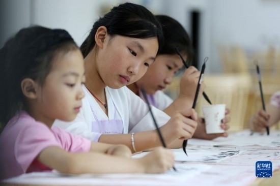 7月12日,在山東省臨沂市郯城縣郯城街道龍泉社區(qū),孩子們在上書法課。