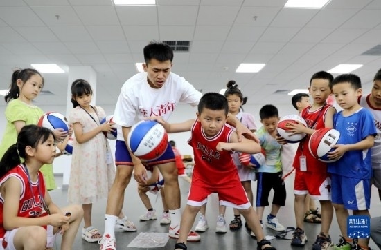 7月11日,在河南省濟源市,孩子們在老師的指導下練習籃球。