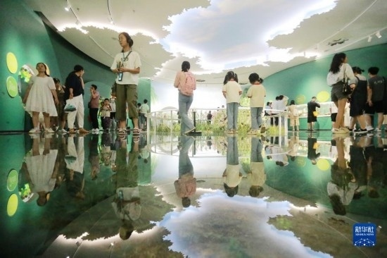 7月12日,小朋友在浙江省科技館里參觀體驗。