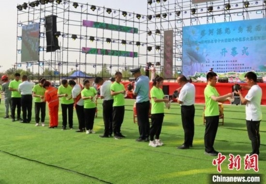 開幕式上,11位優(yōu)秀行業(yè)代表傳遞塔河源頭之水,傳承兵團(tuán)精神。毛琴攝