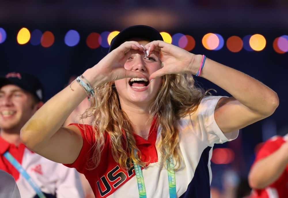 7月28日,美國大學生體育代表團在開幕式上入場。新華社記者 楊青 攝