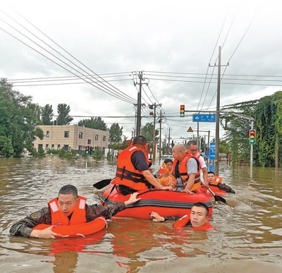 7月31日,武警北京總隊(duì)官兵在北京市房山區(qū)轉(zhuǎn)移被困群眾。當(dāng)日,共轉(zhuǎn)移6個村莊被困群眾676人,協(xié)助轉(zhuǎn)運(yùn)物資1000余件。李卓爾 王 斌攝影報道