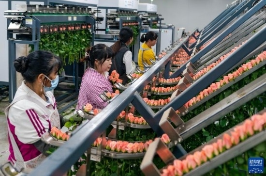 在云天化晉寧花卉產(chǎn)業(yè)現(xiàn)代化示范園內(nèi),花農(nóng)們將鮮切花自動分揀流水線上分揀好的鮮花取下,準(zhǔn)備放入包裝流水線(7月12日攝)。新華社記者 陳欣波 攝