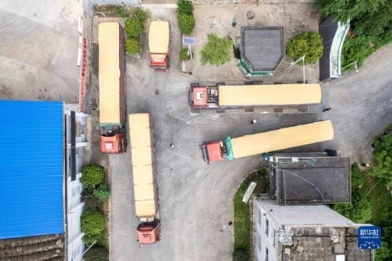 8月7日,運(yùn)糧車在湖南安仁國家糧食儲備庫排隊(duì)過磅(無人機(jī)照片)。