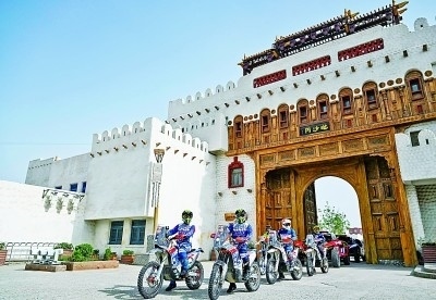 新疆和田地區(qū)約特干故城景區(qū),2023年中國環(huán)塔(國際)拉力賽參賽代表參加旅游展示活動。新華社發(fā)