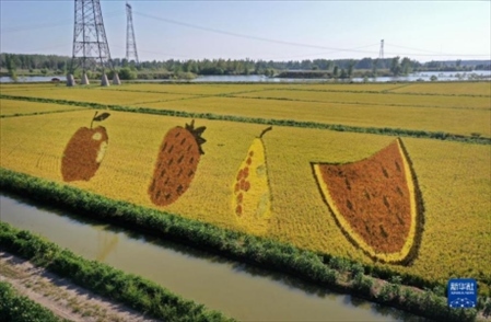 初秋時(shí)節(jié),遼寧省鞍山市臺(tái)安縣遼河文化旅游景區(qū)的稻田畫(huà)吸引不少游客前來(lái)參觀游覽。由多種顏色組成的巨型稻田畫(huà)勾勒出豐收壯美景象。