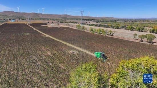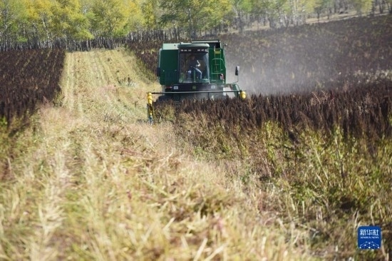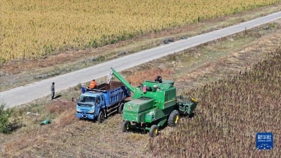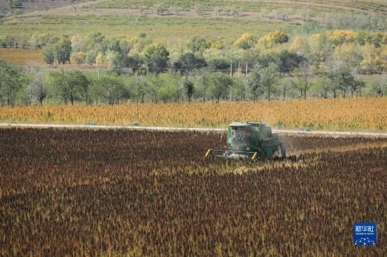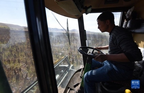 10月1日,在沽源縣白土窯鄉(xiāng)小西溝村,當(dāng)?shù)剞r(nóng)機手在操作收割機收獲藜麥。