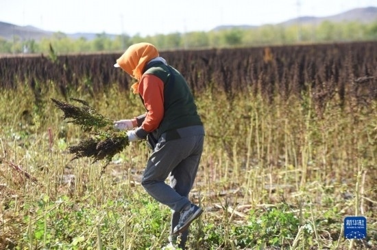 10月1日,在沽源縣白土窯鄉(xiāng)小西溝村,種植戶王秀梅在田間撿拾收割機收割后剩余的藜麥。