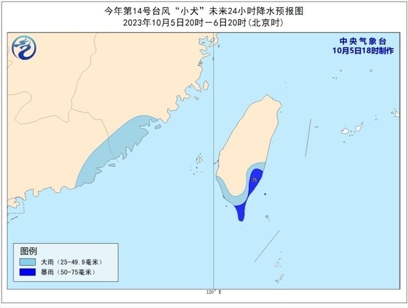 降水預(yù)報:5日20時至6日20時,臺灣島南部、福建東南部、廣東東北部等地將有大雨或暴雨(50-75毫米)。