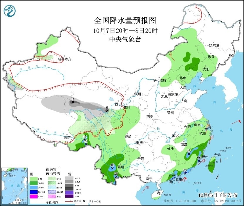 10月6日20時至7日20時,新疆南疆盆地西部沿山地區(qū)、青海南部、西藏東部等地有小到中雪或雨夾雪;西藏東南部、四川盆地東部和南部、云南中東部、福建中南部、廣東東部、海南島南部、臺灣島西部等地部分地區(qū)有中到大雨,其中,廣東東部和福建南部沿海等地局部地區(qū)有暴雨(50~65毫米)。內蒙古中東部、遼東半島、浙江東部沿海等地部分地區(qū)有4~6級風,西藏中部部分地區(qū)有6~7級風。臺灣海峽將有6~7級、陣風8級的東北風,南海東北部海域將有8~9級、陣風10級的偏北風(見圖1)。