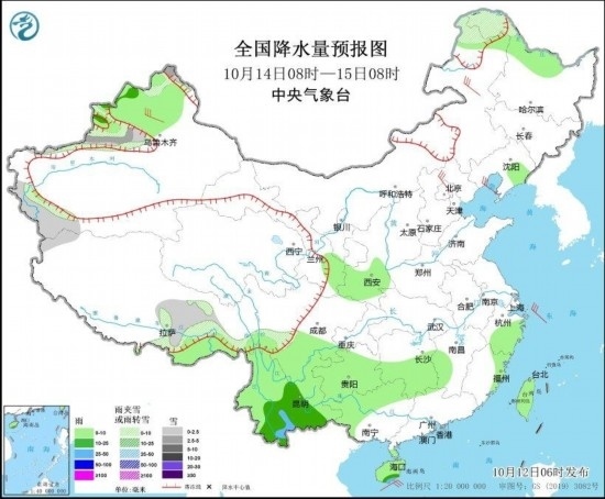 10月14日08時(shí)至15日08時(shí),內(nèi)蒙古東北部、新疆西部、西藏南部等地部分地區(qū)有小到中雪或雨夾雪;黑龍江西北部、遼寧東部、陜西南部、甘肅東南部、四川南部、貴州大部、云南、廣西西部、湖南中南部、江西西南部、浙江中東部、福建東部、海南島及臺(tái)灣島等地部分地區(qū)有小到中雨,其中,云南南部局地有大雨。內(nèi)蒙古東北部、新疆西北部、河北北部等地部分地區(qū)有5~6級(jí)風(fēng);渤海、渤海海峽等海域有6~7級(jí)風(fēng)、陣風(fēng)8~9級(jí)。(見(jiàn)圖3)。