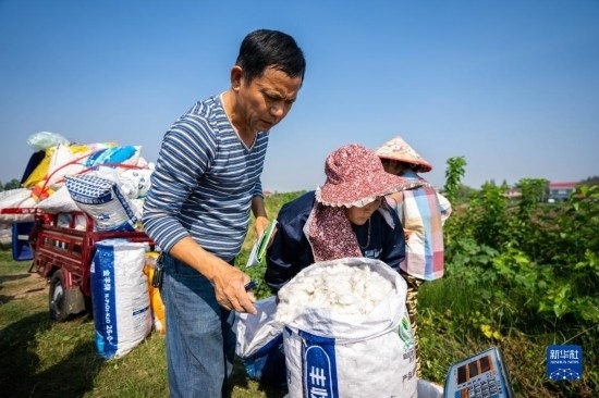 金秋十月,湖南省益陽市南縣種植的4萬余畝棉花相繼進入采收季,當(dāng)?shù)孛揶r(nóng)趁著晴好天氣采摘棉花,田間地頭一片忙碌的景象。
