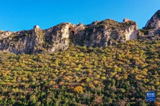 掩映在紅葉中的司馬臺長城(10月15日攝)。