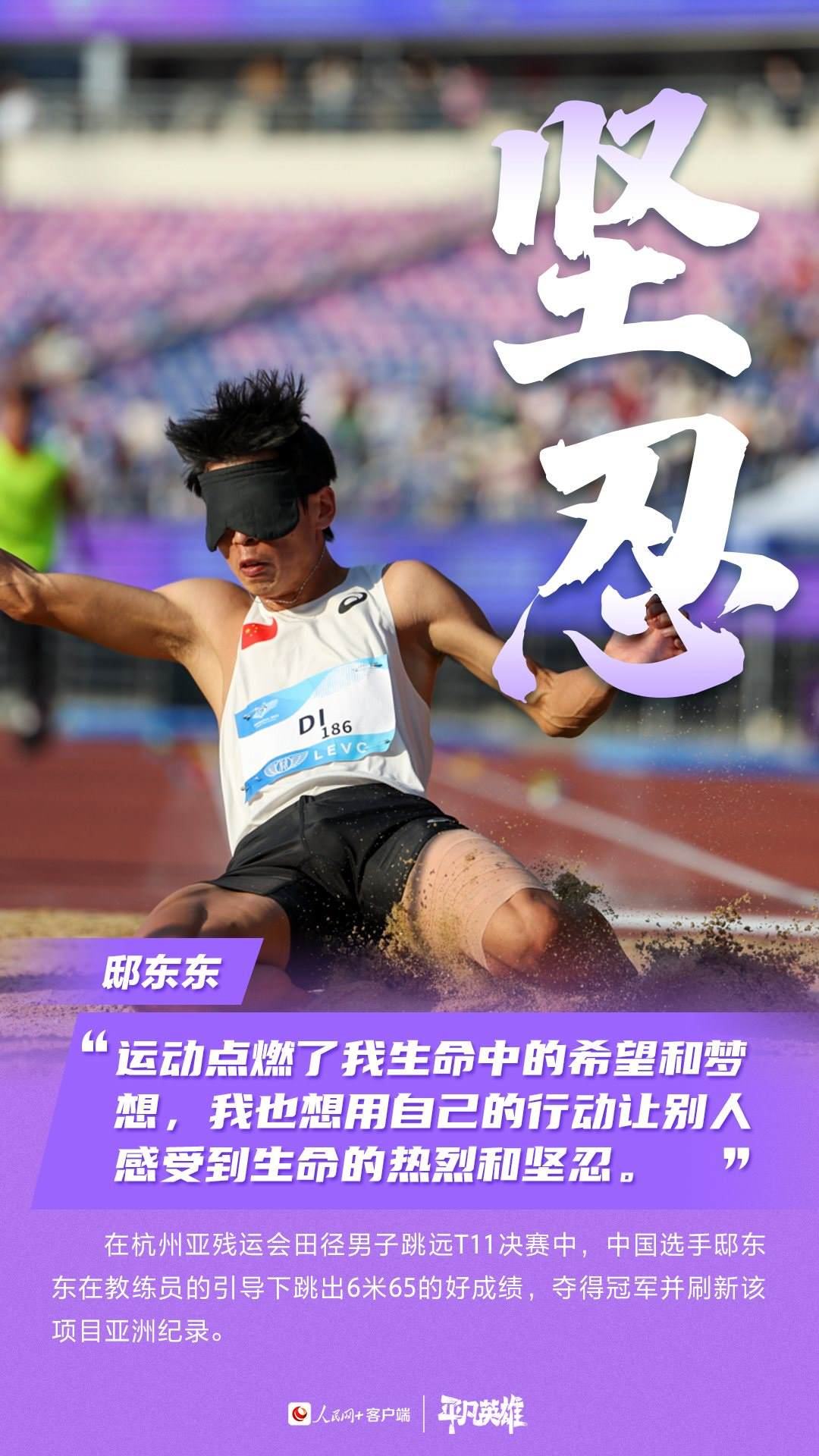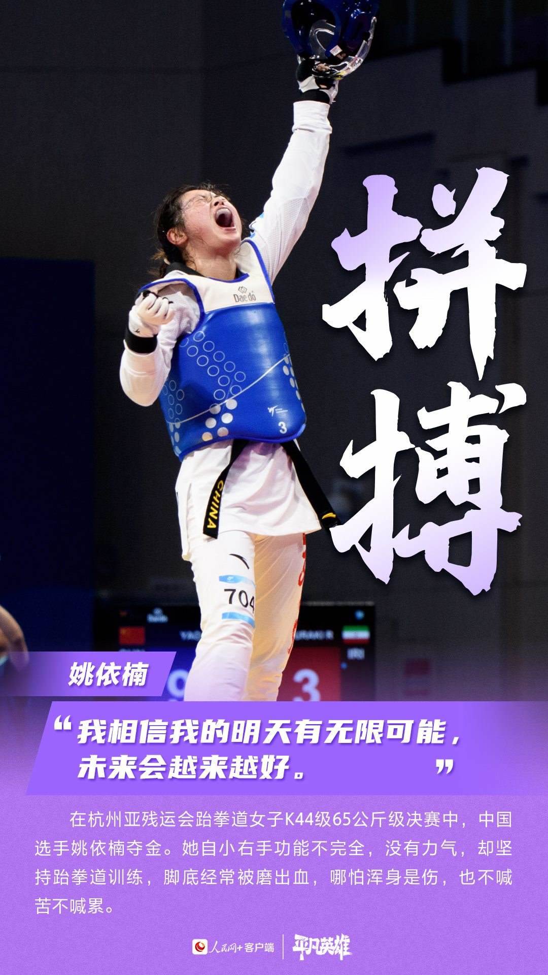 一張張寫滿堅(jiān)韌的臉、一個(gè)個(gè)頑強(qiáng)拼搏的身軀,定格了許多震撼人心的瞬間。在杭州第4屆亞殘運(yùn)會(huì)的賽場(chǎng)上,中國(guó)運(yùn)動(dòng)員用不服輸、不放棄的精神,告訴我們“沒(méi)有什么不可能”。致敬每一位運(yùn)動(dòng)員。
