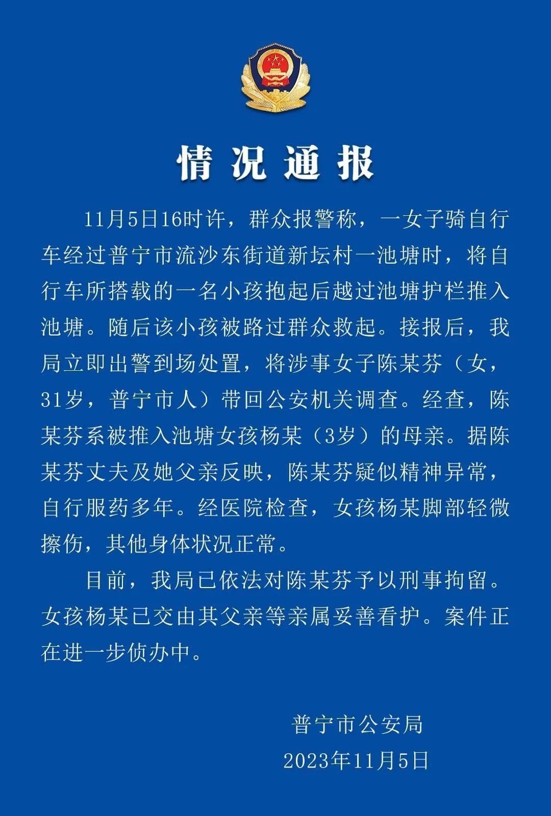 ·警方通報(bào)女子騎車到橋上將孩子推入池塘:該女子疑似精神異常。