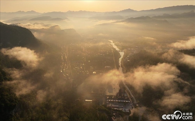 湖南張家界,武陵源景區(qū)內(nèi),朝霞、霧氣交錯(cuò)疊彩,云紗霧幔的小城和群山環(huán)繞的美景交融。