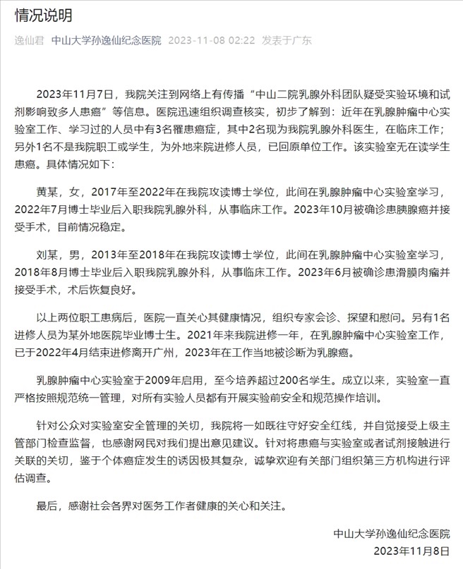 ·中山二院通報(bào)乳腺外科團(tuán)隊(duì)多人患癌:近年有3人患癌,無在讀學(xué)生。