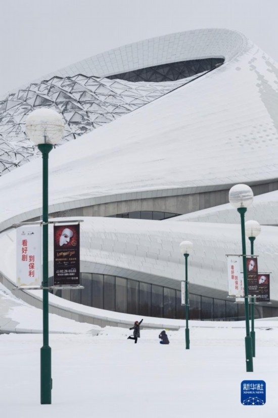 11月9日,游客在哈爾濱大劇院前游玩拍照。
