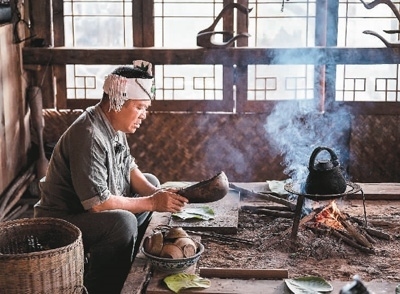 景邁山芒景村的布朗族茶農(nóng)在火塘邊做烤茶。