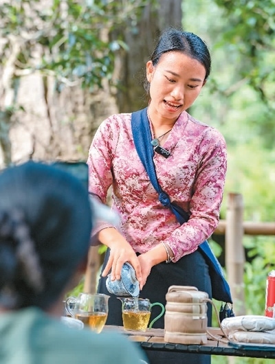 一名傣族姑娘在景邁山大平掌古茶林直播賣茶。