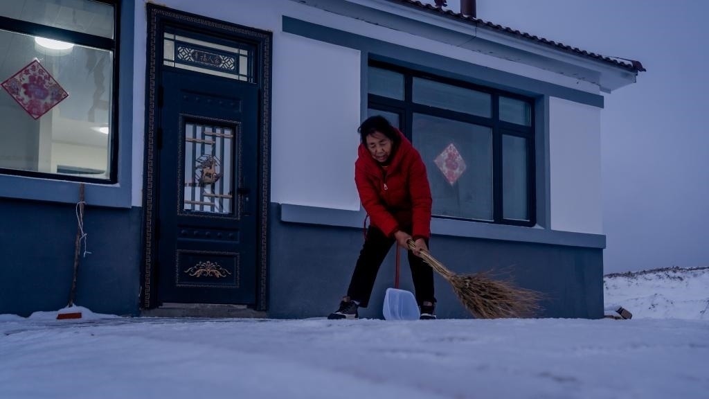 11月23日傍晚,開原鎮(zhèn)新開村村民徐中仁在新房子門前清掃積雪。新華社記者唐成卓 攝