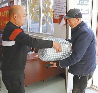 上午10時,走進碼頭村黨群服務(wù)中心,正碰上73歲老人杜金亭騎著電動三輪車,載著老伴來領(lǐng)新棉被。為保障困難群眾冬季取暖,涿州市民政局為全市殘疾人、“六類人群”免費發(fā)放過冬棉被。杜金亭的老伴肢體殘疾,是低保戶?!靶路颗渖闲旅薇?,這個冬天不愁了!”取上新棉被,杜金亭邀請記者去新家看一看。