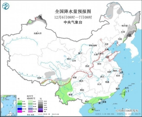 12月6日08時至7日08時,內(nèi)蒙古東北部、黑龍江西北部和東部、吉林東部、遼寧東部、新疆北疆北部和北疆東部、西藏東部、川西高原南部、云南西北部等地部分地區(qū)有小到中雪或雨夾雪,其中,吉林東部、新疆北疆北部等地局地有大到暴雪(10~15毫米)。四川南部、云南大部、廣西東南部、廣東南部、海南島、臺灣島等地部分地區(qū)有小雨,其中,臺灣島東部局地有中雨。內(nèi)蒙古東北部、遼東半島、新疆北疆北部、華北北部、浙江東部等地部分地區(qū)有4~6級風(fēng)。