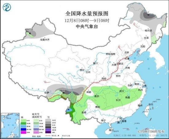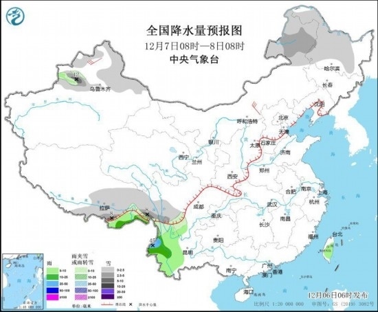 12月7日08時至8日08時,內(nèi)蒙古東部、黑龍江中西部、新疆北部、西藏東部、川西高原南部、云南西北部等地部分地區(qū)有小到中雪或雨夾雪,其中,新疆伊犁河谷、西藏東南部等地局地有大到暴雪(10~12毫米)。西藏南部、四川南部、云南中西部、臺灣島等地部分地區(qū)有小到中雨,其中,云南西部局地有大雨(25~45毫米)。內(nèi)蒙古中部、新疆北疆等地部分地區(qū)有4~6級風(fēng)。