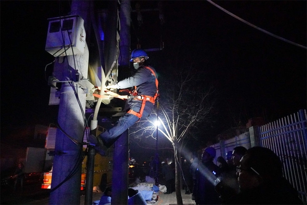 12月19日,在甘肅省臨夏回族自治州積石山保安族東鄉(xiāng)族撒拉族自治縣中西醫(yī)結合醫(yī)院門口,電力部門工作人員搶修電力設施。新華社記者 馬希平 攝