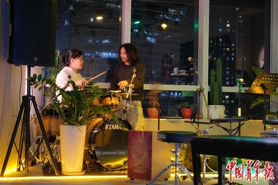12月4日,北京市朝陽區(qū)望京的一處寫字樓里,夜校老師、樂隊鼓手老萬(右)在為一名學員講授架子鼓課程,她是一名零基礎學員。中青報·中青網見習記者 田嘉碩/攝