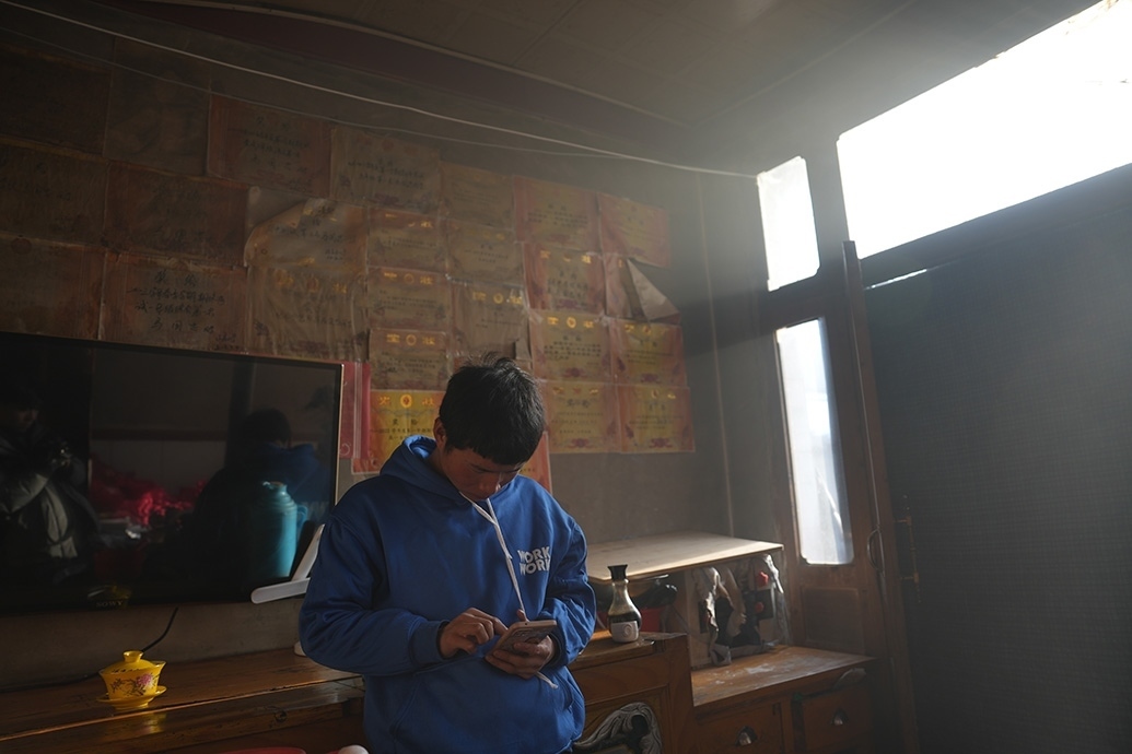 震后,他家木頭架構(gòu)的屋頂傾斜了些,磚瓦墻多處開(kāi)裂,土炕也裂了,柴火的煙從裂縫滲出,有些嗆人。原則上,他家是不能再進(jìn)入了,但上課的話,房間更舒適暖和點(diǎn)。