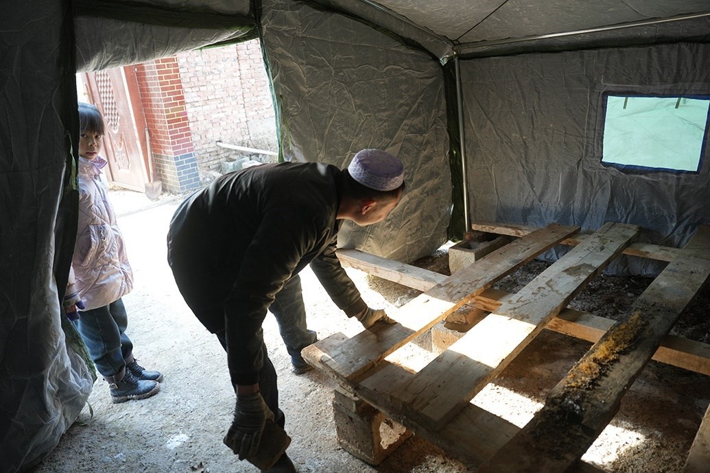 12月20日,馬國(guó)忠一家回到村里,拿塑料布在家附近搭了個(gè)簡(jiǎn)易帳篷,兩根木頭、一條橫梁支起來(lái),怕煙筒把塑料烤化,帳篷里不能烤火,頂多防風(fēng),但馬國(guó)忠覺(jué)得比車?yán)飶?qiáng)多了。家里的電熱毯拿出來(lái)鋪上,他才睡了個(gè)安穩(wěn)覺(jué)。只是半夜來(lái)了余震,又醒了。他止不住想:下一步怎么辦?后面會(huì)不會(huì)繼續(xù)搖?他家鋼管焊的牛棚頂晃得“乒乒乓乓”響。
