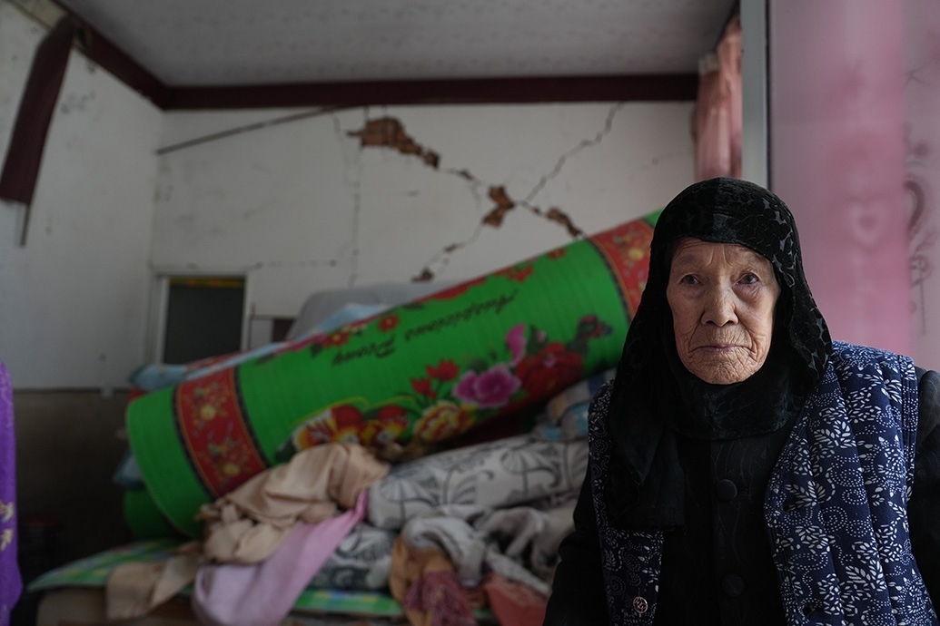12月23日當(dāng)天,馬國(guó)忠和叔叔伯伯兩家都在家門前搭起剛領(lǐng)的帳篷。叔叔馬進(jìn)明家受損嚴(yán)重,兩堵磚墻的銜接處完全開(kāi)裂,像條拉鏈被猛地拽下;天花板掉了大半,木頭架構(gòu)的屋頂赫然露在豁口里。所幸,他和家人平時(shí)在縣城租房住。