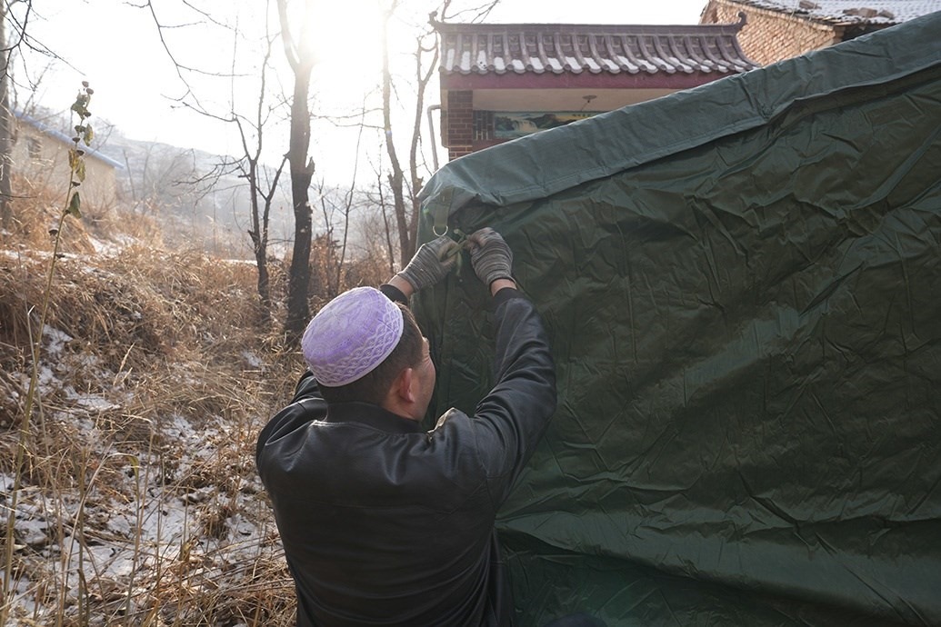 馬國(guó)忠的叔叔在家門口搭帳篷。