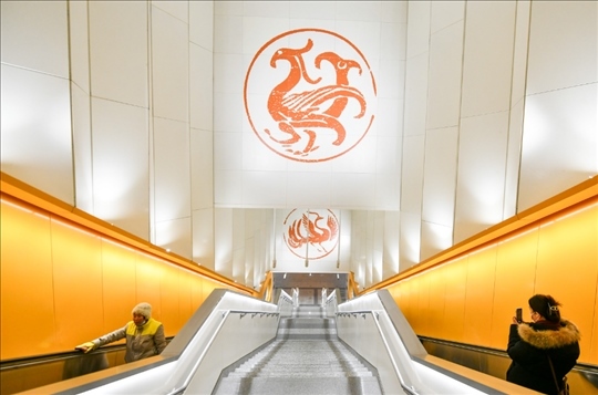 17號線太陽宮站里,仿佛照射進太陽金光,站廳里的暖陽壁畫、上下扶梯時墻壁上的神鳥瓦當,都有不少乘客舉著手機拍照。