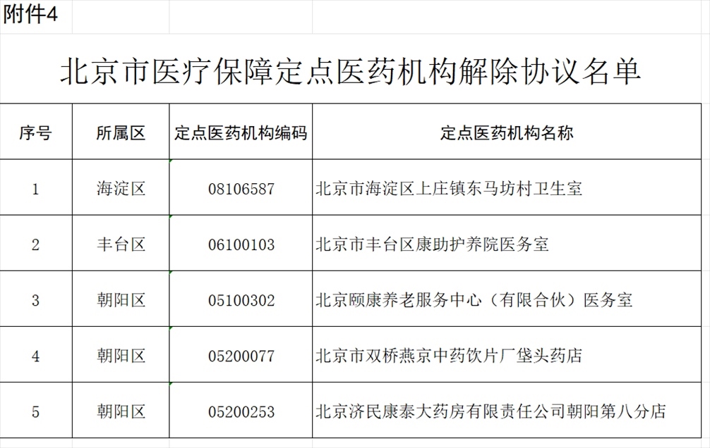 北京市海淀區(qū)上莊鎮(zhèn)東馬坊村衛(wèi)生室等5家定點醫(yī)藥機構因已注銷,申請解除協(xié)議。經(jīng)市、區(qū)醫(yī)保經(jīng)辦機構審核,對上述5家定點醫(yī)藥機構解除協(xié)議(見附件4)。