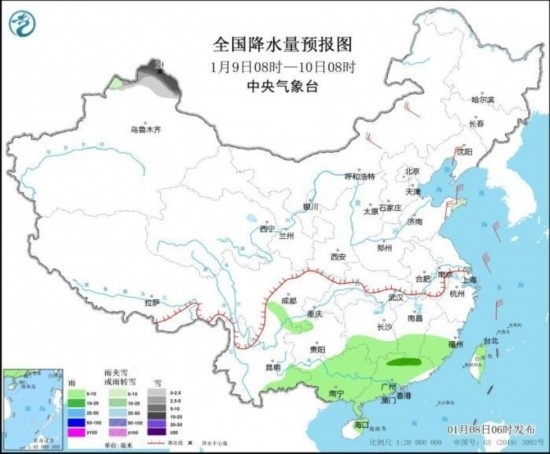 全國降水量預(yù)報(bào)圖(1月9日08時(shí)-10日08時(shí)) 來源:中央氣象臺網(wǎng)站