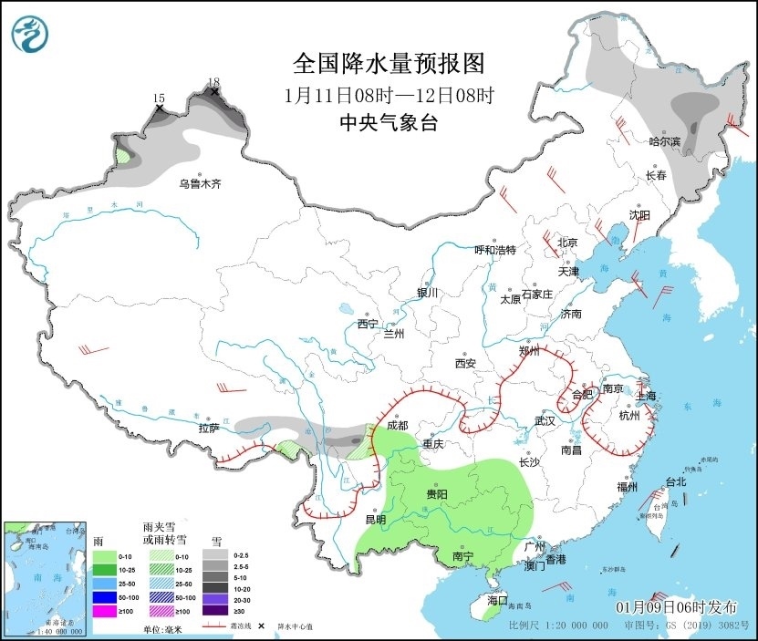 1月11日08時(shí)至12日08時(shí),新疆北部、內(nèi)蒙古東北部、黑龍江、吉林東部、川西高原南部等地的部分地區(qū)有小到中雪或雨夾雪,其中新疆阿勒泰、塔城、伊犁河谷等地的部分地區(qū)有大雪,局地暴雪(10~18毫米);四川南部、湖南西南部、貴州、云南東部、廣西等地的部分地區(qū)有小雨。內(nèi)蒙古中東部、東北地區(qū)南部、華北東部、山東半島、西藏等地的部分地區(qū)有4~6級(jí)風(fēng);黃海北部、臺(tái)灣海峽、臺(tái)灣以東洋面、巴士海峽、南海東北部和西南部等海域有6~7級(jí)風(fēng)、陣風(fēng)8~9級(jí)(見(jiàn)圖3)。