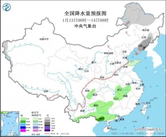 全國降水量預報圖(1月13日08時-14日08時)